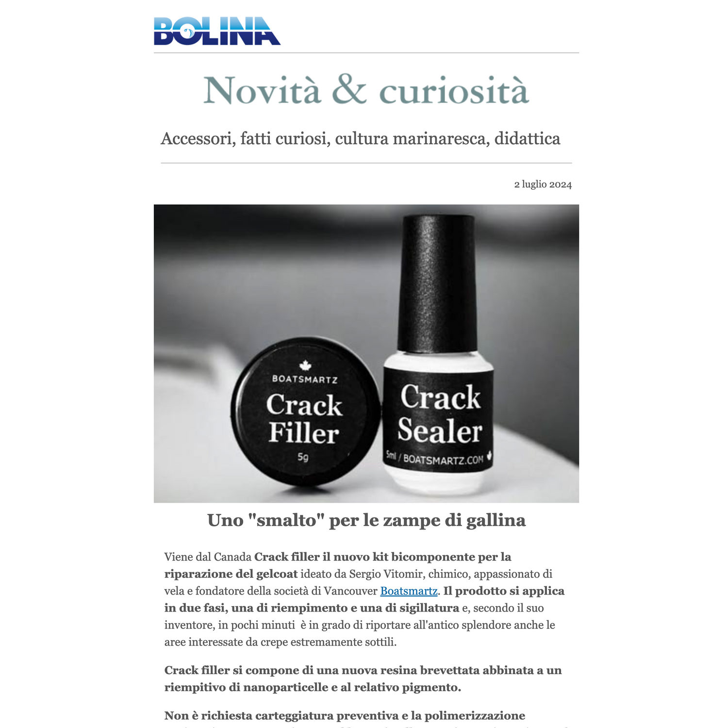 Boatsmartz Gelcoat Repair Kit featured in Italian sailing newspaper, Bolina. Translated excerpt, "in just a few minutes it can restore even areas affected by extremely thin cracks to their former glory."